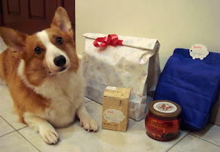 The first batch of gifts I'm posing with actually had gifts with doggy or corgi motifs if they weren't edible. So I think they all rock! (just that I can't really use them eh? Mummy says they are all the pawsomest gifts ever!)